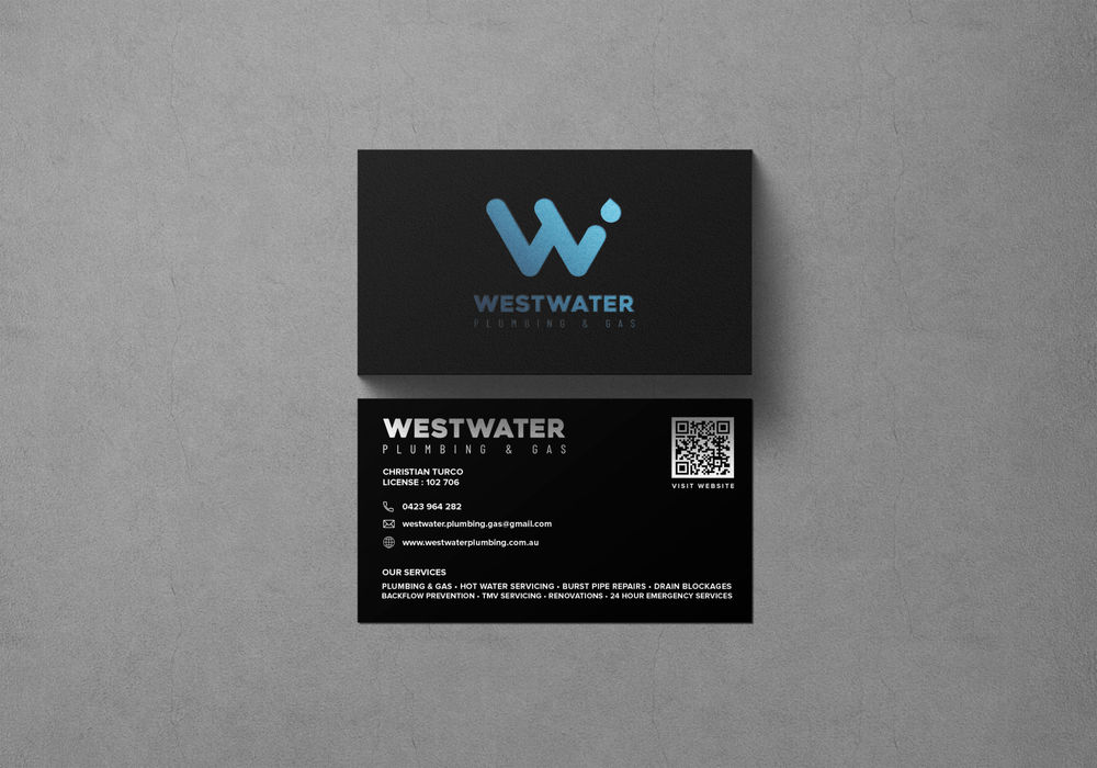 Create a comprehensive brand identity for Westwater Plumbing & Gas, including a website design, logo design, business card design, and uniform design. The goal is to establish a cohesive and professional visual identity that reflects the company's commitment to quality service.